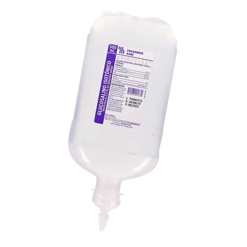 El suero glucosalino es una solución para perfusión utilizada en la prevención del déficit de agua con escasa pérdida salina (deshidrataciones hipertónica ó isotónica) o como solución soporte para administrar medicamentos o electrolitos, junto con un ligero aporte de energía.